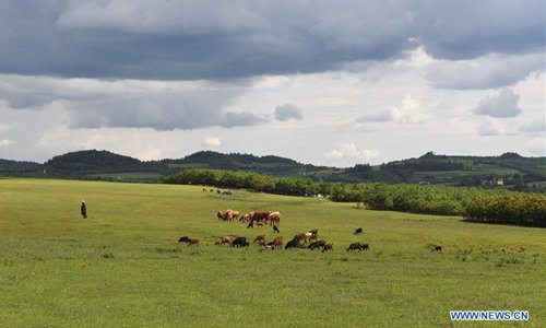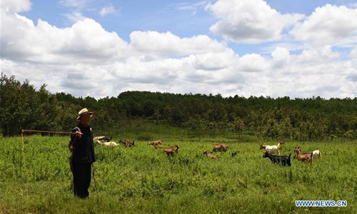An elderly man herds at Beidaying Grassland in Hekou Town of Xundian Hui and Yi Autonomous County, southwest China's Yunnan Province, Aug. 10, 2019. (Photo: Xinhua)