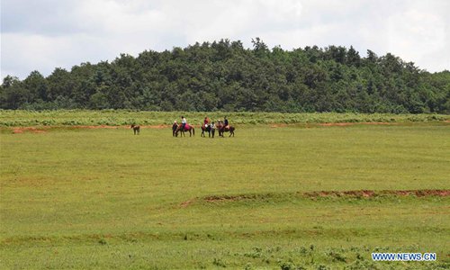 Tourists ride horses at Beidaying Grassland in Hekou Town of Xundian Hui and Yi Autonomous County, southwest China's Yunnan Province, Aug. 10, 2019. (Photo: Xinhua)