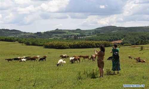 Tourists take photos at Beidaying Grassland in Hekou Town of Xundian Hui and Yi Autonomous County, southwest China's Yunnan Province, Aug. 10, 2019. (Photo: Xinhua)