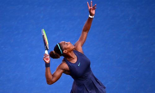 Serena Williams serves against Marie Bouzkova during their semifinal match at the Rogers Cup on Saturday in Toronto. Photo: VCG