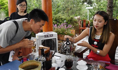A visitor tastes Pu'er tea at the Yunnan Garden at the Beijing International Horticultural Exhibition in Beijing, capital of China, Aug. 11, 2019. The "Yunnan Day" event was held at the Beijing International Horticultural Exhibition on Sunday. (Xinhua/Zhang Chenlin)
