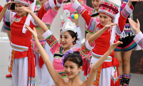 Dancers perform at the Yunnan Garden at the Beijing International Horticultural Exhibition in Beijing, capital of China, Aug. 11, 2019. The "Yunnan Day" event was held at the Beijing International Horticultural Exhibition on Sunday. (Xinhua/Zhang Chenlin)