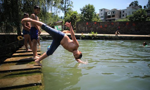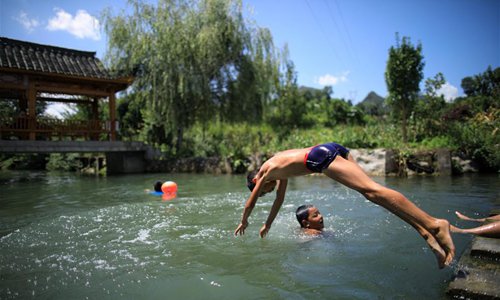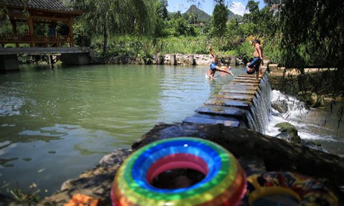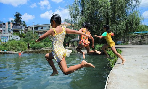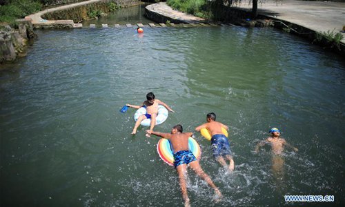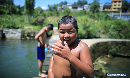 Children play in a pool in Shuitian Township of Wudang District in Guiyang, southwest China's Guizhou Province, Aug. 11, 2019. (Xinhua/Liu Xu)