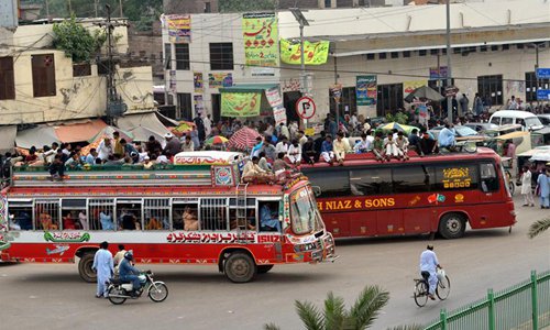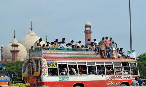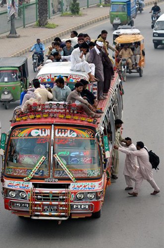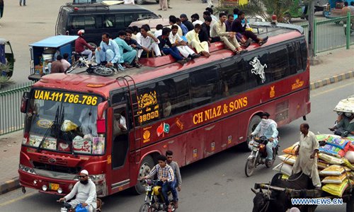 Passengers are seen on an overcrowded bus ahead of the Eid al-Adha festival in Lahore, Pakistan, on Aug. 11, 2019. (Photo by Jamil Ahmed/Xinhua)