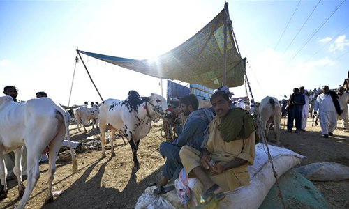 Vendors wait for customers at a livestock market on the eve of Eid al-Adha festival in Islamabad, capital of Pakistan, on Aug. 11, 2019. (Xinhua/Ahmad Kamal)