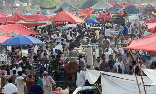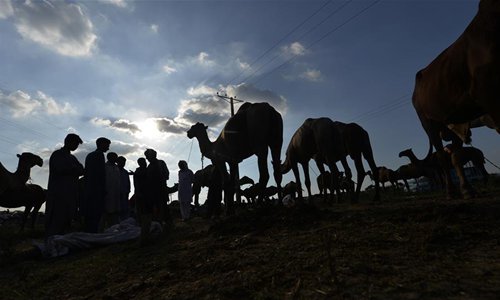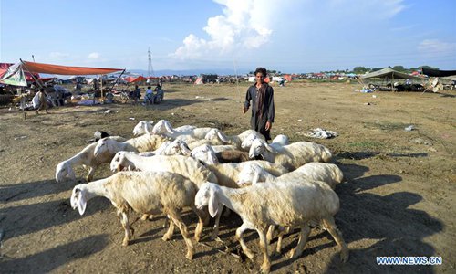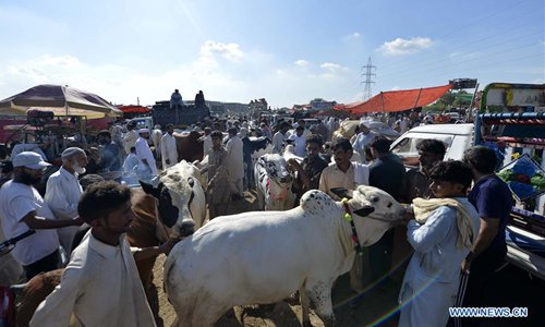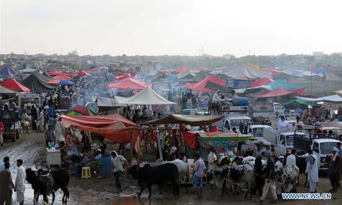 People visit a livestock market on the eve of Eid al-Adha festival in Islamabad, capital of Pakistan, on Aug. 11, 2019. (Xinhua/Ahmad Kamal)