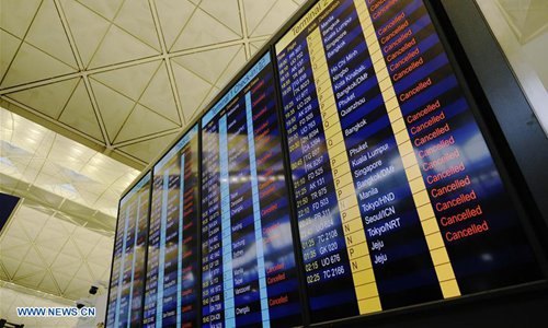 Cancelled flights are shown on a screen at Hong Kong International Airport in Hong Kong, south China, Aug. 12, 2019. All flights in and out of China's Hong Kong Special Administrative Region were cancelled on Monday due to a protest held in the Hong Kong International Airport, according to local airport authority. (Xinhua/Wang Shen)