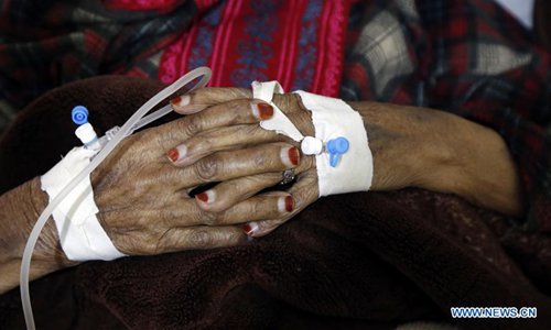 A cholera-infected woman receives medical treatments at a health center in Sanaa, Yemen, on Aug. 12, 2019. The cholera in Yemen has set the world's highest record with the infection of one million people and over 2,000 have been confirmed dead since 2017, according to World Health Organization. (Photo by Mohammed Mohammed/Xinhua)