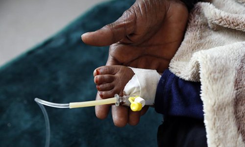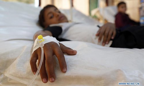 A cholera-infected child receives medical treatments at a health center in Sanaa, Yemen, on Aug. 12, 2019. The cholera in Yemen has set the world's highest record with the infection of one million people and over 2,000 have been confirmed dead since 2017, according to World Health Organization. (Photo by Mohammed Mohammed/Xinhua)