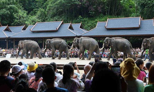 Tourists watch an Asian elephant parade during a public awareness activity on the occasion of World Elephant Day in a tourism area in the Dai Autonomous Prefecture of Xishuangbanna, southwest China's Yunnan Province, Aug. 12, 2019. (Xinhua/Yang Zongyou)