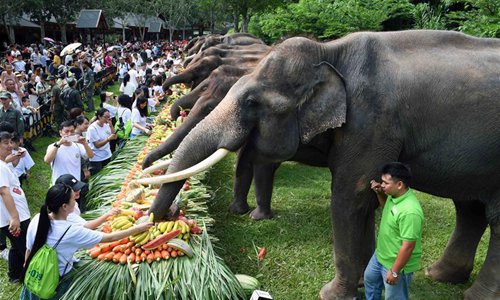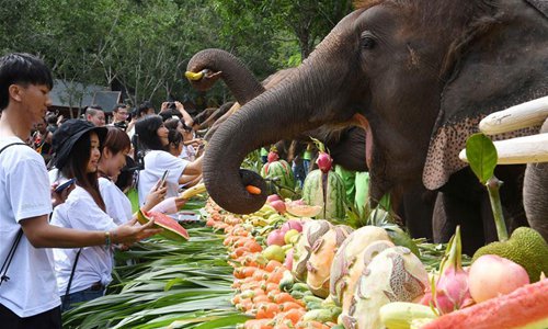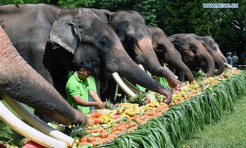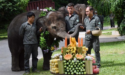 Staff members celebrate the birthday of Yang Niu, a four-year-old Asian elephant, during a public awareness activity on the occasion of World Elephant Day in a tourism area in the Dai Autonomous Prefecture of Xishuangbanna, southwest China's Yunnan Province, Aug. 12, 2019. (Xinhua/Yang Zongyou)