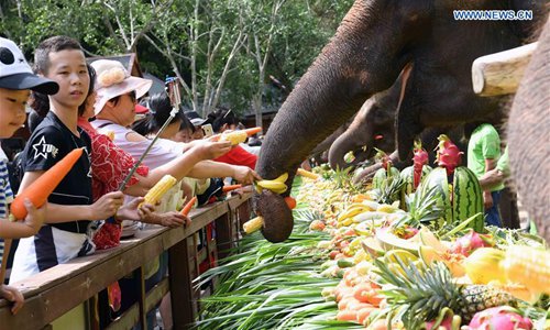 Volunteers feed Asian elephants during a public awareness activity on the occasion of World Elephant Day in a tourism area in the Dai Autonomous Prefecture of Xishuangbanna, southwest China's Yunnan Province, Aug. 12, 2019. (Xinhua/Yang Zongyou)