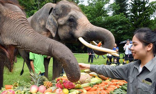 Staff members feed Asian elephants during a public awareness activity on the occasion of World Elephant Day in a tourism area in the Dai Autonomous Prefecture of Xishuangbanna, southwest China's Yunnan Province, Aug. 12, 2019. (Xinhua/Yang Zongyou)