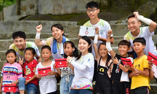 Volunteers from Macao and local children gesture during a health class at Wuying, a village of Miao ethnic group under joint administration by Rongshui County in Guangxi Zhuang Autonomous Region and its neighbouring Congjiang County of Guizhou Province, southwest China, Aug. 10, 2019. (Xinhua/Huang Xiaobang)