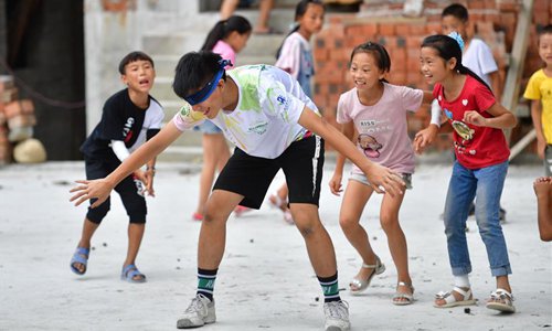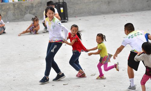 A volunteer from Macao plays a game with local children at Wuying, a village of Miao ethnic group under joint administration by Rongshui County in Guangxi Zhuang Autonomous Region and its neighbouring Congjiang County of Guizhou Province, southwest China, Aug. 11, 2019.(Xinhua/Huang Xiaobang)