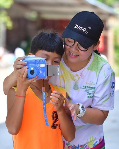 A volunteer from Macao teaches a child how to use camera at Wuying, a Miao village under joint administration of Rongshui County, south China's Guangxi Zhuang Autonomous Region, and Congjiang County, southwest China's Guizhou Province, Aug. 11, 2019. (Xinhua/Huang Xiaobang)