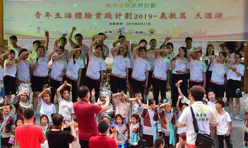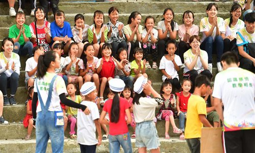 Volunteers from Macao and local children stage a performance at Wuying, a village of Miao ethnic group under joint administration by Rongshui County in Guangxi Zhuang Autonomous Region and its neighbouring Congjiang County of Guizhou Province, southwest China, Aug. 11, 2019. (Xinhua/Huang Xiaobang)