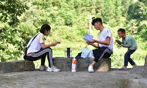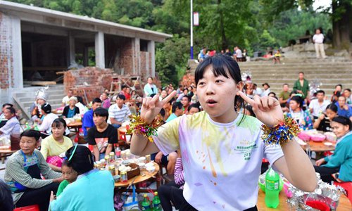 Volunteers from Macao prepare for a performance at Wuying, a village of Miao ethnic group under joint administration by Rongshui County in Guangxi Zhuang Autonomous Region and its neighbouring Congjiang County of Guizhou Province, southwest China, Aug. 11, 2019. (Xinhua/Huang Xiaobang)
