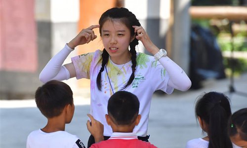 A volunteer from Macao plays a game with local children at Wuying, a village of Miao ethnic group under joint administration by Rongshui County in Guangxi Zhuang Autonomous Region and its neighbouring Congjiang County of Guizhou Province, southwest China, Aug. 10, 2019. More than 30 student volunteers from south China's Macao offered a week-long teaching service for children in this remote village. Volunteers prepared various classes including painting, acting, science and PE to enrich local children's summer vacation and broaden their horizon. (Xinhua/Huang Xiaobang)