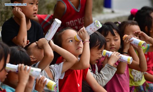 Children experience self-made kaleidoscopes during a science class at Wuying, a village of Miao ethnic group under joint administration by Rongshui County in Guangxi Zhuang Autonomous Region and its neighbouring Congjiang County of Guizhou Province, southwest China, Aug. 10, 2019. More than 30 student volunteers from south China's Macao offered a week-long teaching service for children in this remote village. Volunteers prepared various classes including painting, acting, science and PE to enrich local children's summer vacation and broaden their horizon. (Xinhua/Huang Xiaobang)
