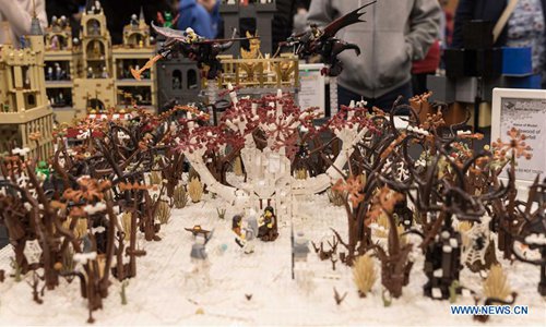 LEGO works of "Godswood of Winterfell" is displayed at the Brick Expo in Canberra, capital of Australia, Aug. 11, 2019. Held in the Hellenic Club of Canberra, the two-day expo showcasing LEGO works attracted many visitors. (Photo by Liu Changchang/Xinhua)