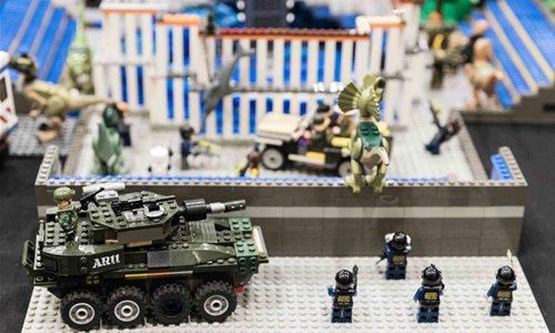 LEGO works themed on Jurassic World is displayed at the Brick Expo in Canberra, capital of Australia, Aug. 11, 2019. Held in the Hellenic Club of Canberra, the two-day expo showcasing LEGO works attracted many visitors. (Photo by Liu Changchang/Xinhua)