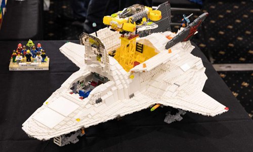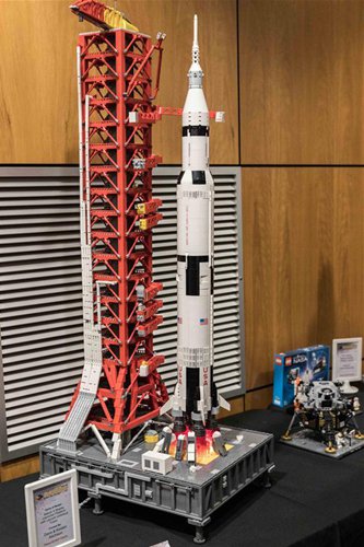 LEGO works of a space ship named "Saturn V Mobile Launcher Umbilical Tower" is displayed at the Brick Expo in Canberra, capital of Australia, Aug. 11, 2019. Held in the Hellenic Club of Canberra, the two-day expo showcasing LEGO works attracted many visitors. (Photo by Liu Changchang/Xinhua)