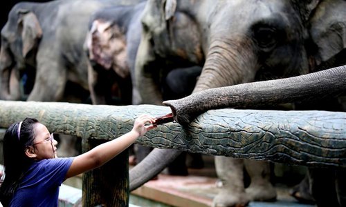 A girl feeds an Asian elephant at the Yangon Zoological Garden in Yangon, Myanmar, Aug. 12, 2019, the World Elephant Day. The World Elephant Day is marked on Aug. 12 every year, to bring attention to the urgent plight of Asian and African elephants. (Xinhua/U Aung)