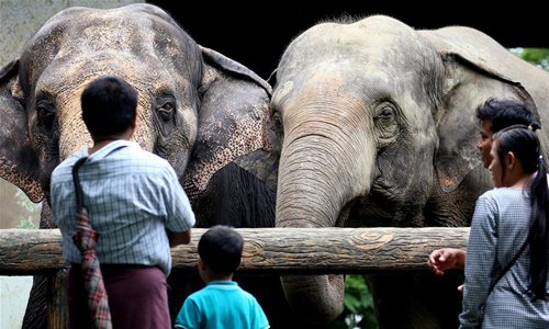 Tourists view Asian elephants at the Yangon Zoological Garden in Yangon, Myanmar, Aug. 12, 2019, the World Elephant Day. The World Elephant Day is marked on Aug. 12 every year, to bring attention to the urgent plight of Asian and African elephants. (Xinhua/U Aung)