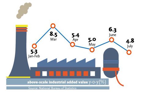 The growth in both services and manufacturing sectors slowed down during the month. The added values of major industrial enterprises grew 4.8 percent year-on-year in July, down from 6.3 percent growth in June.