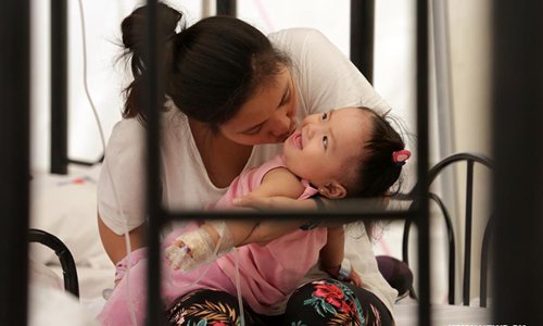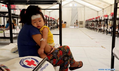 A mother plays with her sick child as they rest with other dengue patients at a Dengue Emergency Medical Unit set up by the Philippine Red Cross in Cavite Province, the Philippines, Aug. 13, 2019.(Xinhua/Rouelle Umali)