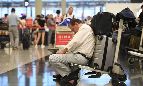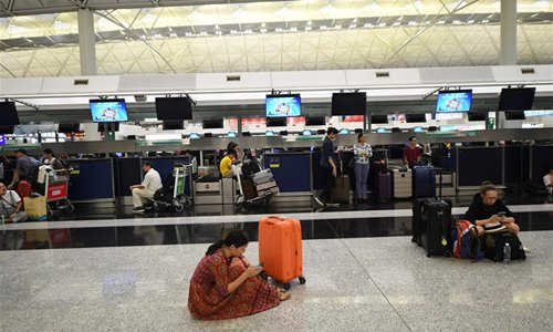 Tourists are stranded due to chaos caused by protesters at Hong Kong International Airport in Hong Kong, south China, Aug. 13, 2019. Protesters created chaos at the Hong Kong International Airport for the second day on Tuesday, causing cancellations of most outbound flights at one of the busiest airports in the world. (Xinhua/Lui Siu Wai)
