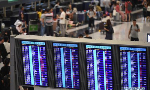 A screen displays flight status of the Hong Kong International Airport in Hong Kong, south China, Aug. 13, 2019. Protesters created chaos at the Hong Kong International Airport for the second day on Tuesday, causing cancellations of most outbound flights at one of the busiest airports in the world. (Xinhua/Lui Siu Wai)