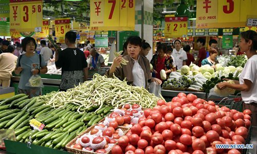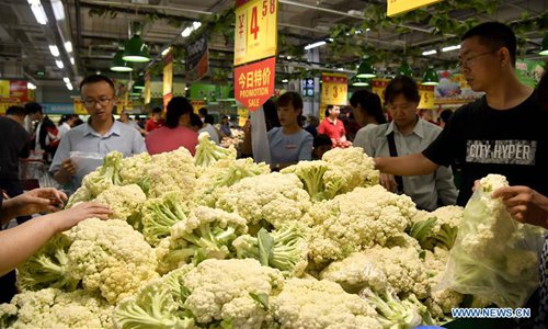 People buy vegetables at a supermarket in Shouguang, east China's Shandong Province, Aug. 13, 2019. The supply of vegetables maintained stable after Typhoon Lekima hit Shouguang, a major vegetable production base in China. (Xinhua/Guo Xulei)