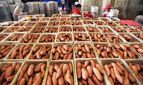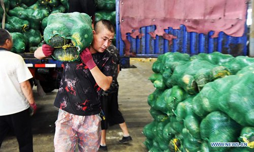 Staff members arrange sweet potatoes at a logistics park in Shouguang, east China's Shandong Province, Aug. 13, 2019. The supply of vegetables maintained stable after Typhoon Lekima hit Shouguang, a major vegetable production base in China. (Xinhua/Wang Kai)