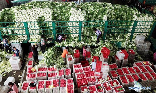 A staff member arranges vegetables at a logistics park in Shouguang, east China's Shandong Province, Aug. 13, 2019. The supply of vegetables maintained stable after Typhoon Lekima hit Shouguang, a major vegetable production base in China. (Xinhua/Wang Kai)