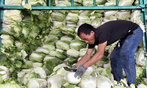 A staff member arranges vegetables at a logistics park in Shouguang, east China's Shandong Province, Aug. 13, 2019. The supply of vegetables maintained stable after Typhoon Lekima hit Shouguang, a major vegetable production base in China. (Xinhua/Guo Xulei)
