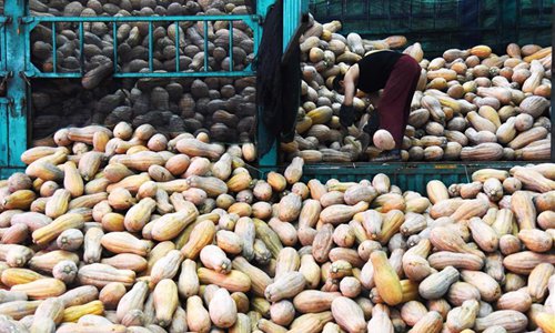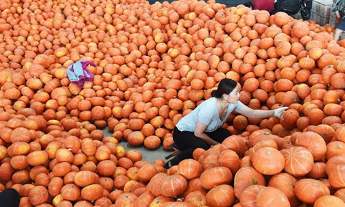 A staff member arranges pumpkins at a logistics park in Shouguang, east China's Shandong Province, Aug. 13, 2019. The supply of vegetables maintained stable after Typhoon Lekima hit Shouguang, a major vegetable production base in China. (Xinhua/Wang Kai)