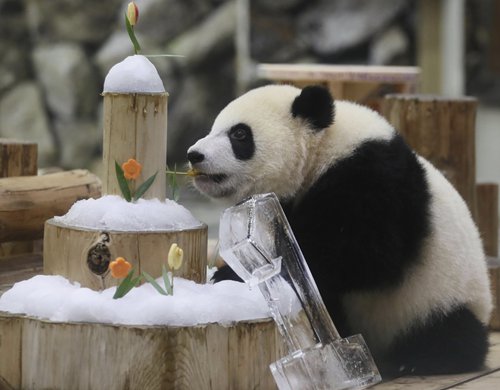 Giant panda Saihin plays with her birthday cake at Adventure World in Shirahama, Japan on Wednesday, her first birthday. Two hundred people were chosen by lottery to take part in her birthday party. Photo: IC