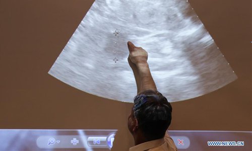 Thomas Hildebrandt, head of the reproduction management department at Germany's Leibniz Institute for Zoo and Wildlife Research, points the position of the embryo during a press conference at the Zoo Berlin in Berlin, capital of Germany, on Aug. 14, 2019. Zoo Berlin is getting ready to welcome one or two newborn panda cubs as experts say it's very likely that the 6-year-old panda Meng Meng is pregnant. (Xinhua/Shan Yuqi)