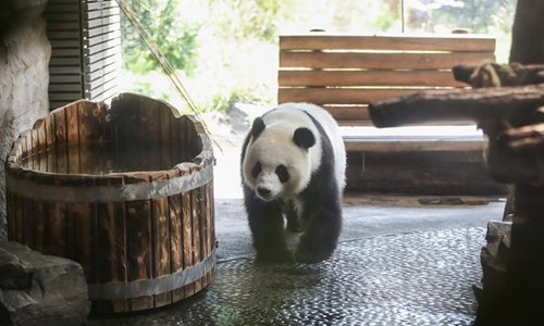 Photo taken on Aug. 14, 2019 shows panda Meng Meng at the Zoo Berlin in Berlin, capital of Germany. Zoo Berlin is getting ready to welcome one or two newborn panda cubs as experts say it's very likely that the 6-year-old panda Meng Meng is pregnant. (Xinhua/Shan Yuqi)