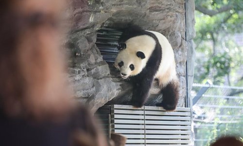 Panda Meng Meng plays at the Zoo Berlin in Berlin, capital of Germany, on Aug. 14, 2019. Zoo Berlin is getting ready to welcome one or two newborn panda cubs as experts say it's very likely that the 6-year-old panda Meng Meng is pregnant. (Xinhua/Shan Yuqi)