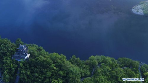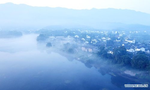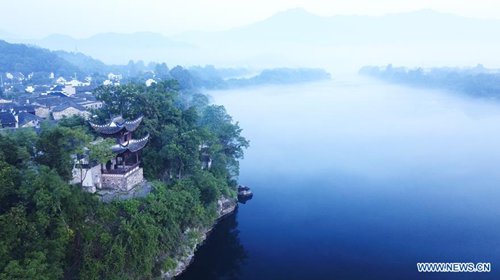 Aerial photo taken on Aug. 15, 2019 shows a view of Huaixian Pavilion in Taohuatan scenic area, Jingxian County of Xuancheng, east China's Anhui Province.(Photo: Xinhua)