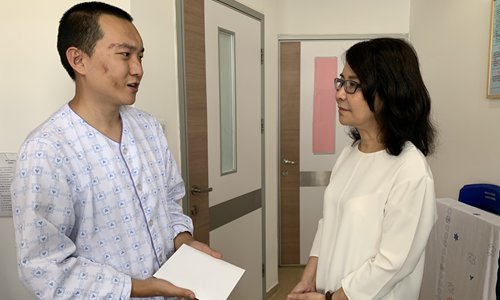 Vivian K.Cheung, deputy director of Hong Kong International Airport visits Fu Guohao, Global Times reporter at a hospital in Shenzhen, South China's Guangdong Province. Photo: Chen Qingqing/GT