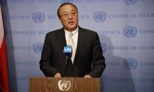 Zhang Jun, Chinese Permanent Representative to the United Nations, speaks to the press on the situation in Jammu and Kashmir, at the UN headquarters in New York, on Aug. 16, 2019. (Xinhua/Li Muzi)