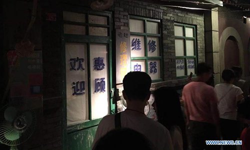 Mobile photo shows people visiting an exhibition about old Beijing at Wangfujing Department Store in Beijing, capital of China, Aug. 17, 2019. (Xinhua/Ma Yan)
