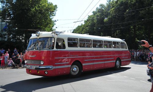 An old-timer bus is seen during the traditional car parade of Riga Retro 2019 in Riga, Latvia, on Aug. 17, 2019. The annual old-timer meeting Riga Retro 2019 organized by Antique Automobile Club of Latvia and Riga Motor Museum kicked off here on Saturday. More than 100 antique vehicles of different periods of time and styles took part in the event. (Photo by Janis/Xinhua)