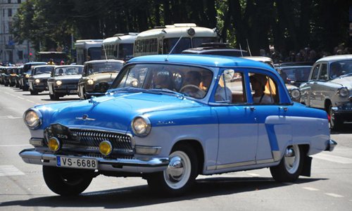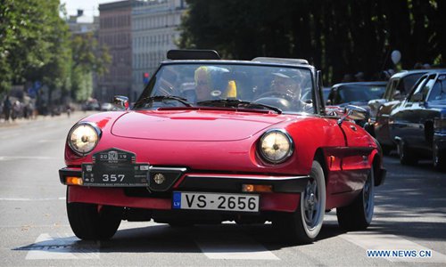 An old-timer car is seen during a traditional car parade of Riga Retro 2019 in Riga, Latvia, on Aug. 17, 2019. The annual old-timer meeting Riga Retro 2019 organized by Antique Automobile Club of Latvia and Riga Motor Museum kicked off here on Saturday. More than 100 antique vehicles of different periods of time and styles took part in the event. (Photo by Janis/Xinhua)