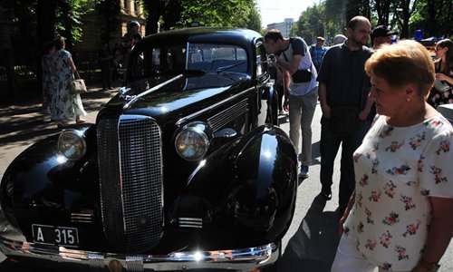 Visitors view an old-timer car during Riga Retro 2019 in Riga, Latvia, on Aug. 17, 2019. The annual old-timer meeting Riga Retro 2019 organized by Antique Automobile Club of Latvia and Riga Motor Museum kicked off here on Saturday. More than 100 antique vehicles of different periods of time and styles took part in the event. (Photo by Janis/Xinhua)