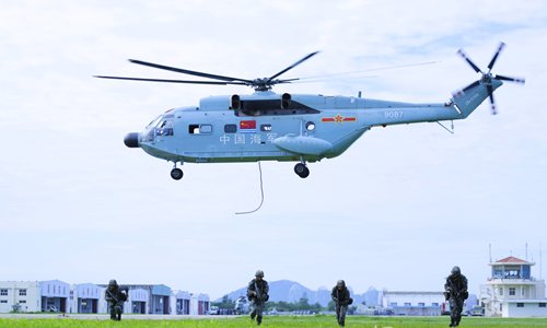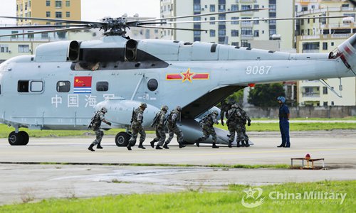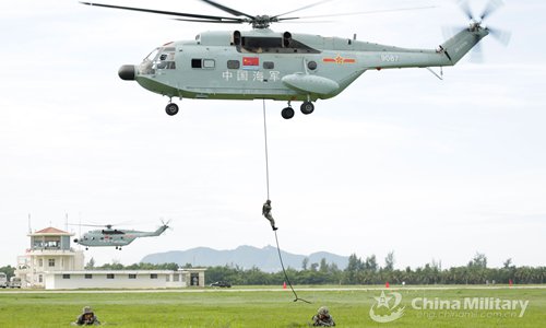 Soldiers assigned to the PLA 74th Group Army conduct fast-roping from a helicopter attached to a Navy aviation regiment during a joint fast-rope training exercise on the shore of the South China Sea on Aug. 14, 2019. (eng.chinamil.com.cn/Photo by Cheng Xinan, Yang Fan and Huang Benrui)